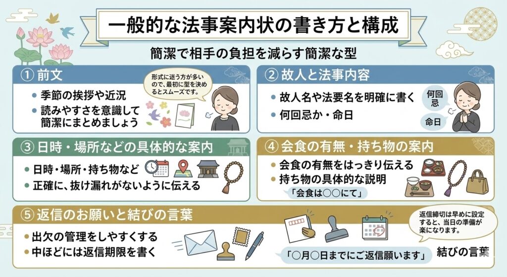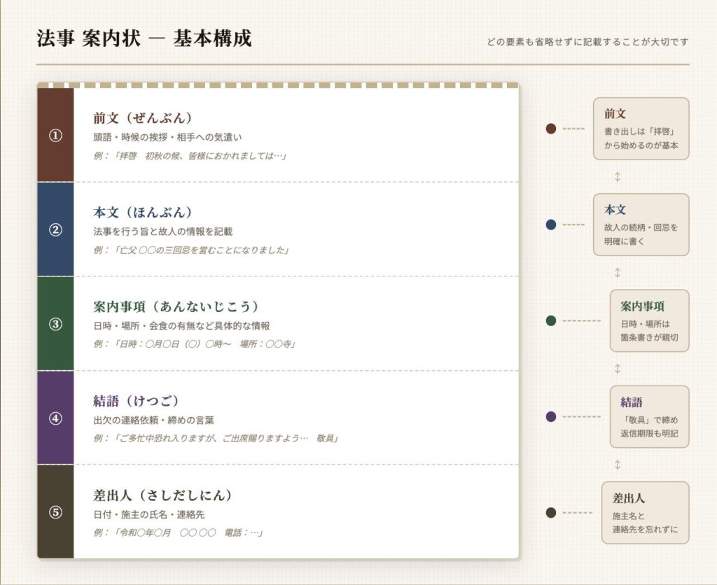 法事の案内状は、大きく5つの構成で作られます。