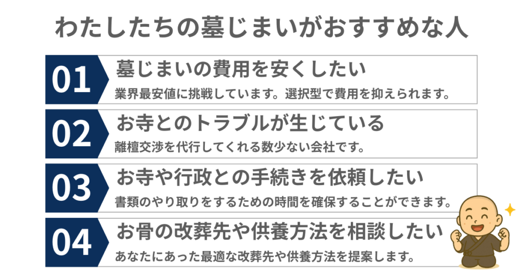 わたしたちの墓じまいは、以下のサービスを行っています。