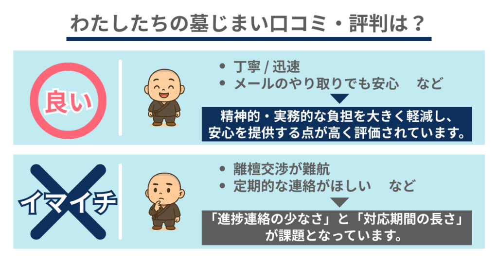 でも、重荷に感じていた墓じまいや離檀を全て代行して頂き大変助かりました。ありがとうございます。引用: わたしたちの墓じまい